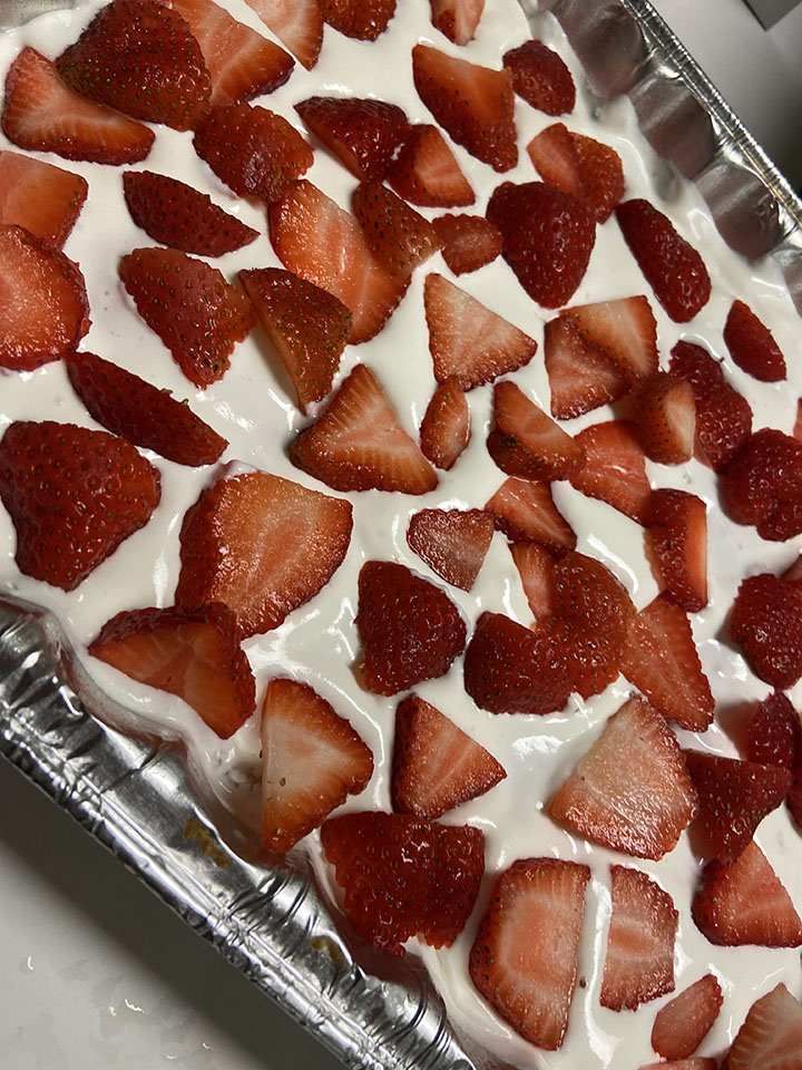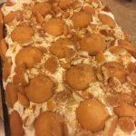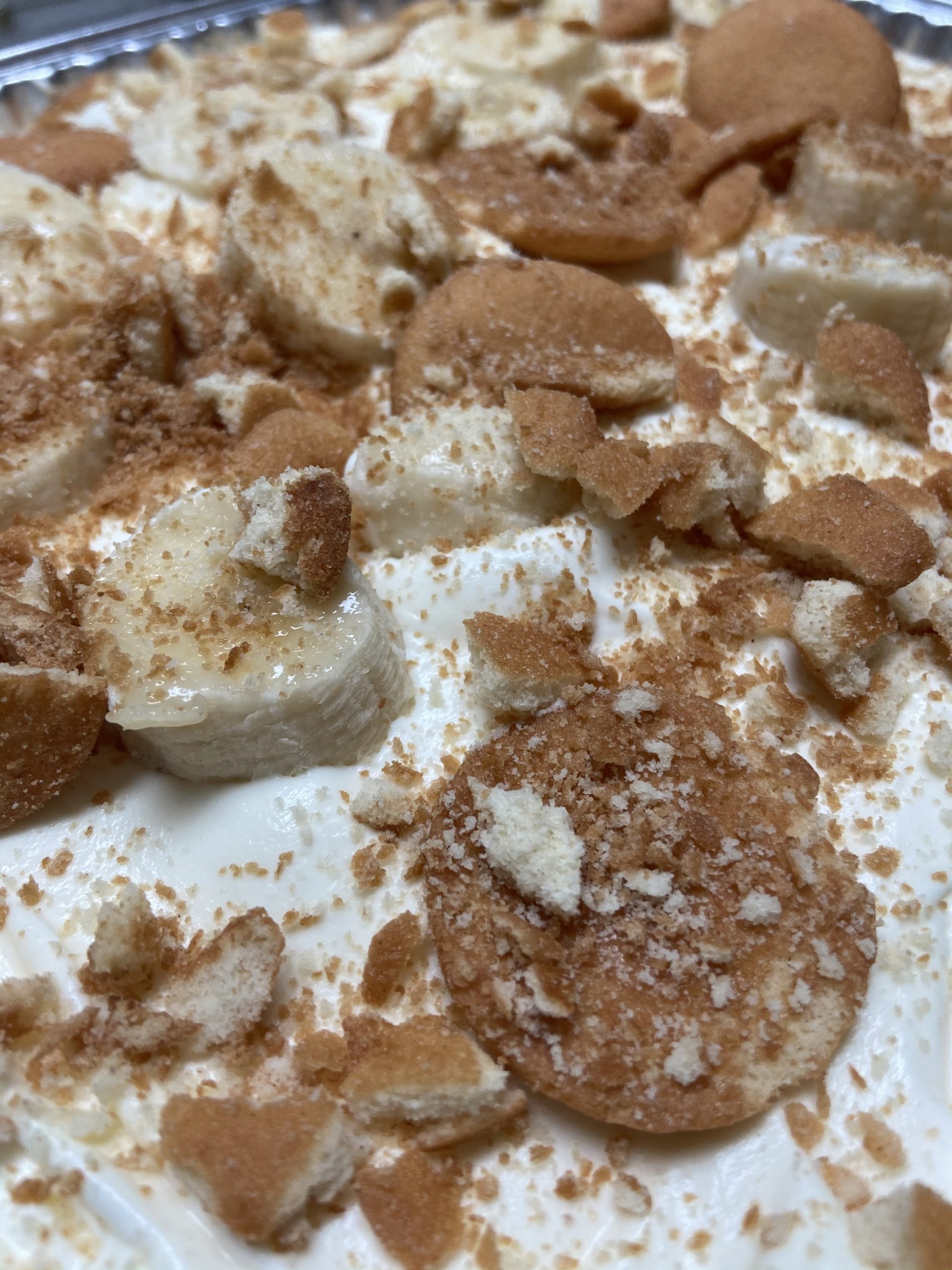 Banana Cake Topped with Banana Pudding, Nilla Wafer Crumbles, and Whipped Creme.