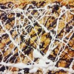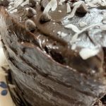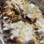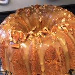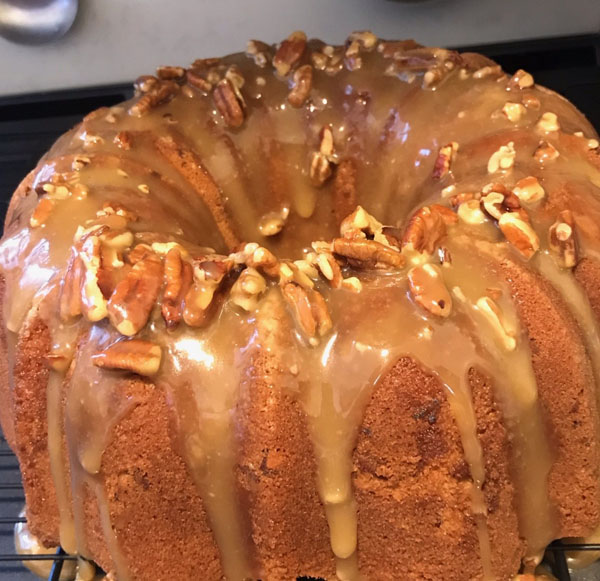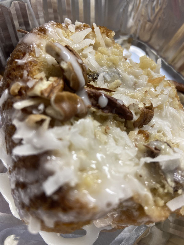 BEST SELLER! Coconut Rum Poke Bundt Cake, topped with Toasted Coconuts, Pecans, and RumChata Drizzle.