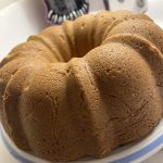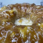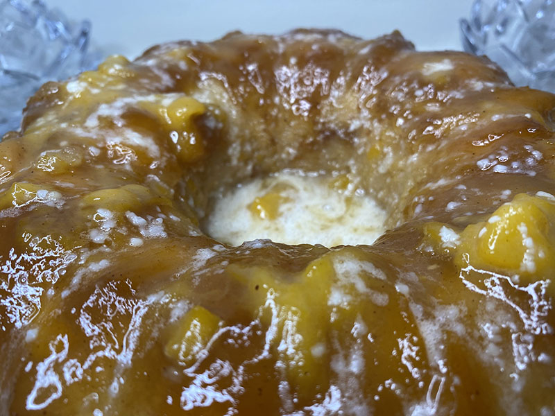 Peach Cobbler Pound Cake with Brown Sugar and Cinnamon Peaches baked throughout and on top. Peach Drizzle Optional.