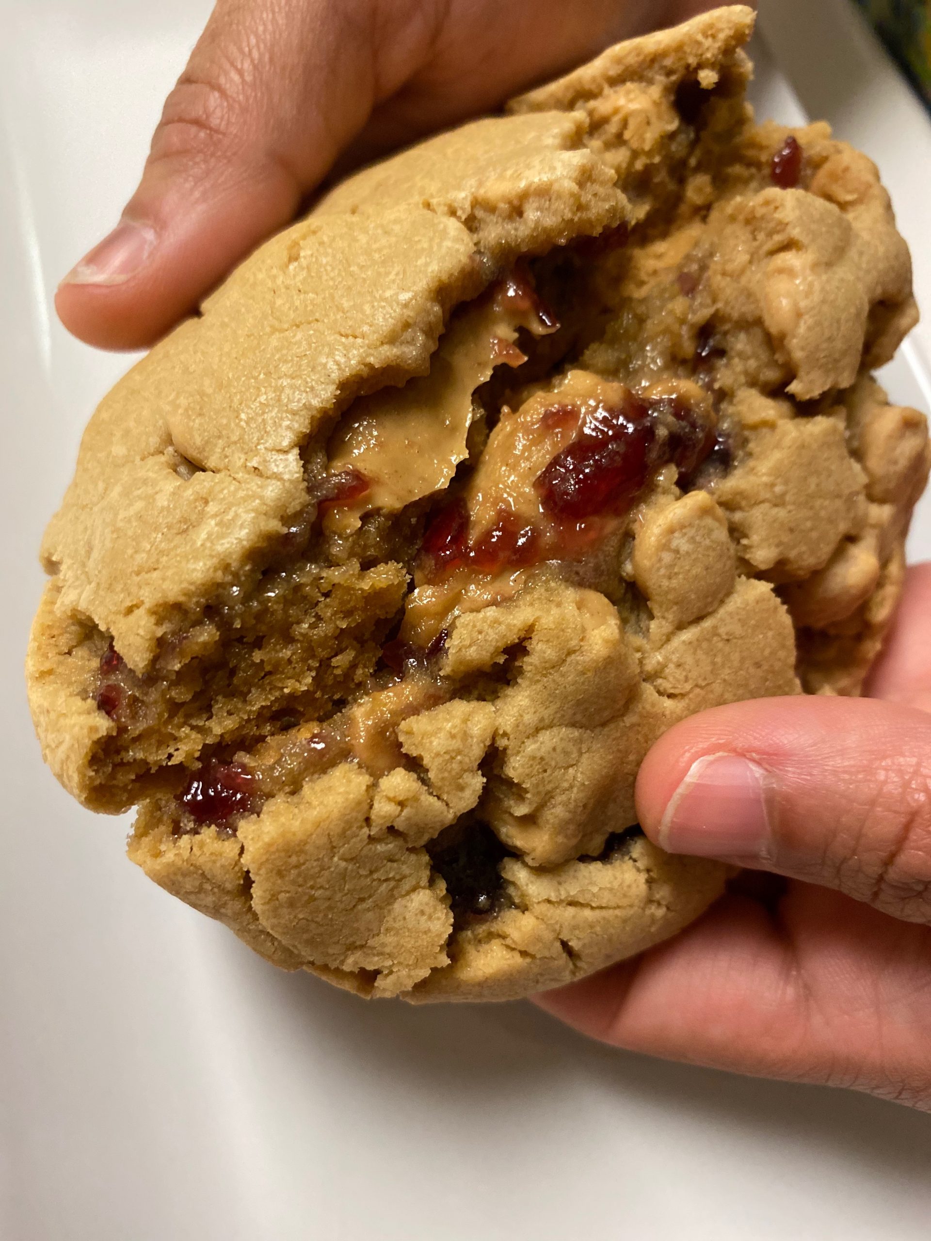 Huge Peanut butter cookies, stuffed with Sugar free Chunky Peanut Butter, and Grape Jelly.